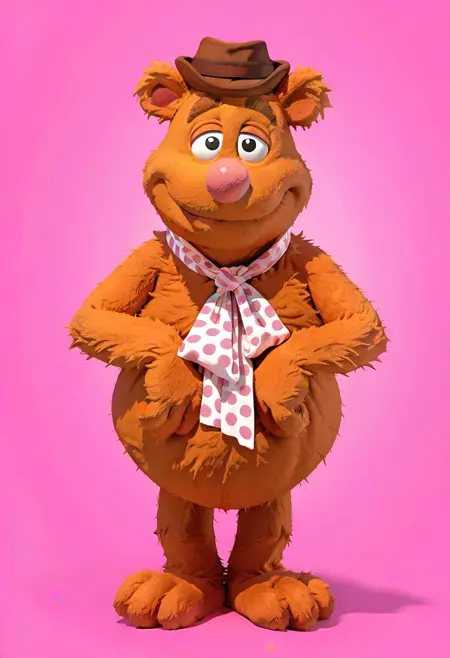 FozzieBearTM, 1boy, black eyes, orange-brown fur, pink rounded nose, bushy beige-brown eyebrows, magenta eyelids, brown porkpie hat, white scarf with pink polka dots, fat, chubby