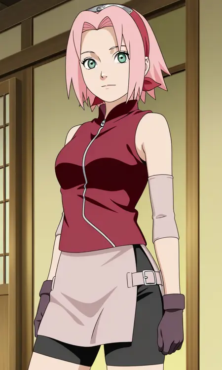 sakura_haruno, short hair, pink hair, green eyes, forehead, red hairband, konohagakure symbol, sleeveless, red shirt, zipper, bare shoulder, elbow pads, mini skirt, black bike shorts, gloves, toeless footwear,