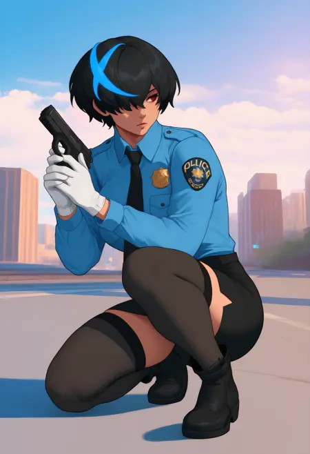 トリガー+外見: 短い髪、ストライプ入りの髪、黒髪、青髪、片方の目に髪がかかる、赤い目