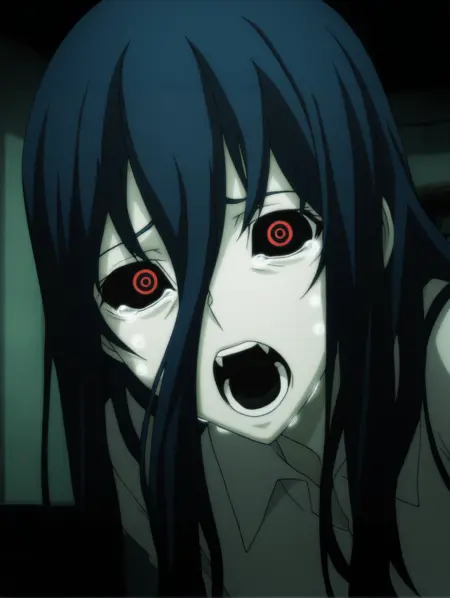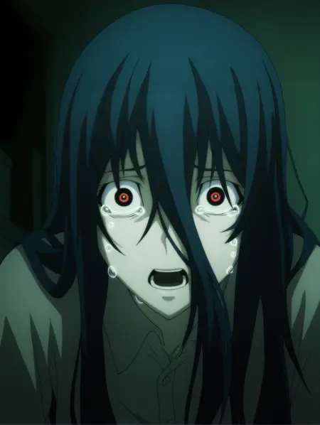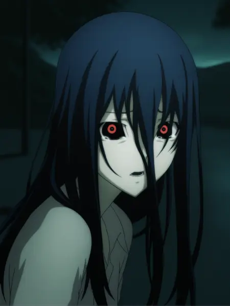 시키: 창백한 피부, 싱글, 붉은 눈, 파란 머리, 긴 머리, 눈 사이의 머리카락