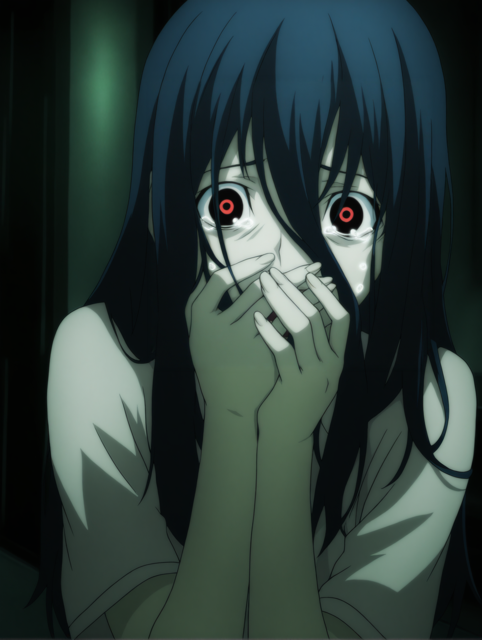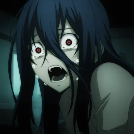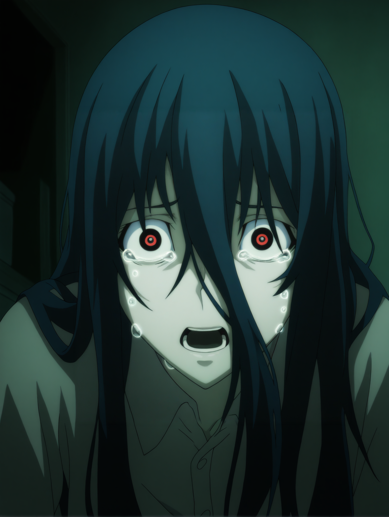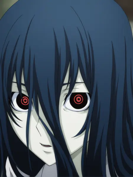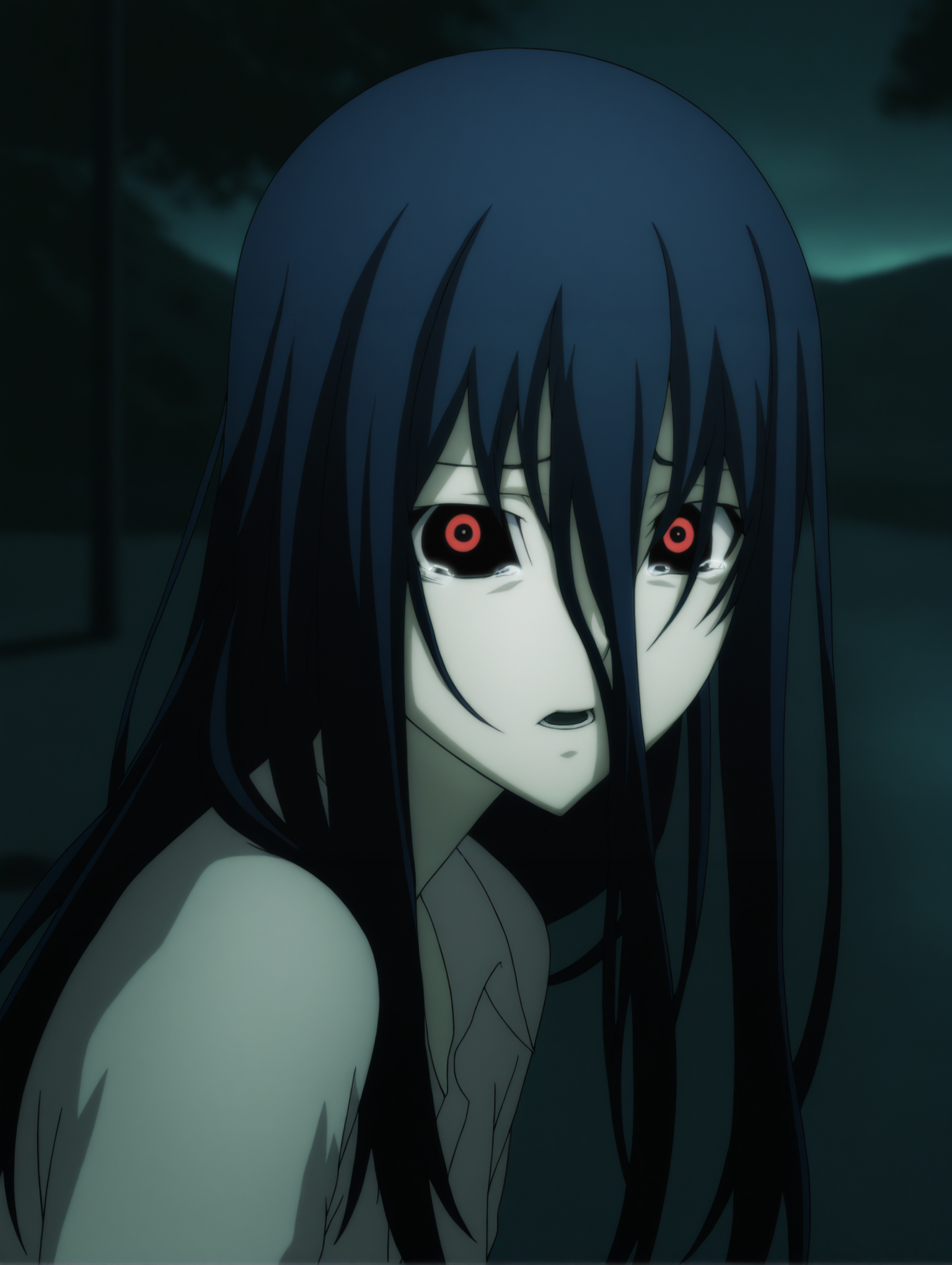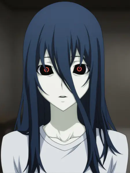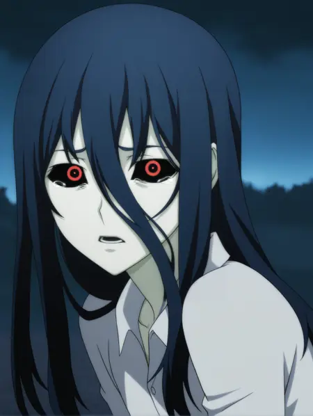 尸鬼:苍白皮肤,独一人,红眼,蓝发,长发,头发位于双眼之间