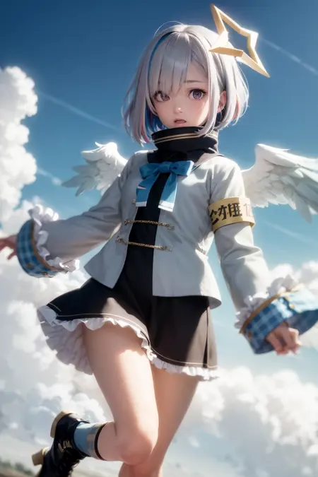 outfit1aakanata, short hair, multicolored hair, grey hair, yellow halo, purple eyes, wings, turtleneck, white sailor collar, blue bowtie, grey jacket, long sleeves, plaid, armband, frilled skirt, black skirt