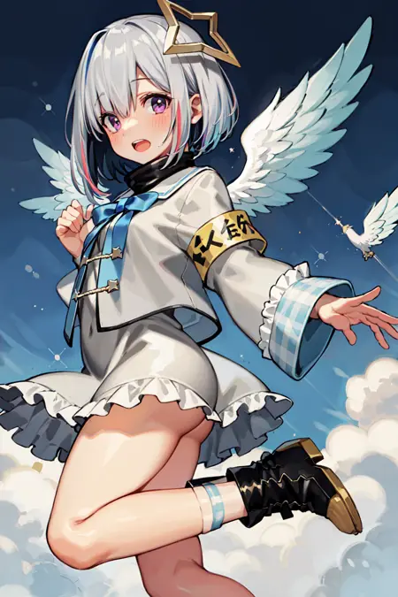 outfit9-2 (无夹克)hhkanata, long hair, multicolored hair, grey hair, one side up, pink halo, purple eyes, wings, necktie, chest harness, short dress, white dress, sleeveless, wrist cuffs, fingerless gloves, white gloves, belt pouch