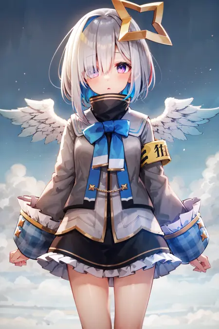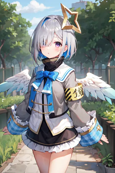 outfit1aakanata, short hair, multicolored hair, grey hair, yellow halo, purple eyes, wings, turtleneck, white sailor collar, blue bowtie, grey jacket, long sleeves, plaid, armband, frilled skirt, black skirt