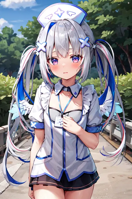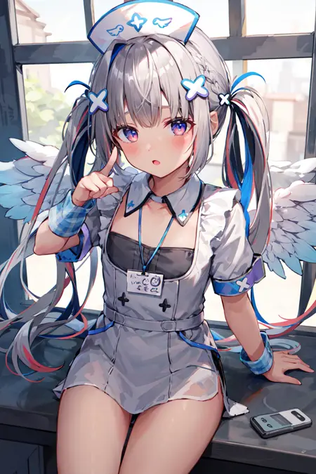 outfit5-1 (ツインテール)ddkanata, long hair, multicolored hair, grey hair, twintails, nurse cap, x hair ornament, purple eyes, wings, detached collar, lanyard, frills, white dress, short sleeves, armband, bandaged arm, white gloves, white apron, white pantyhose
