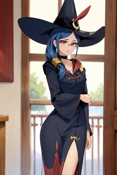 プロンプトに「ローブ、ロングドレス、サイドポニテール、魔女帽、チョーカー、眼鏡、赤い目」を追加すると良いでしょう。