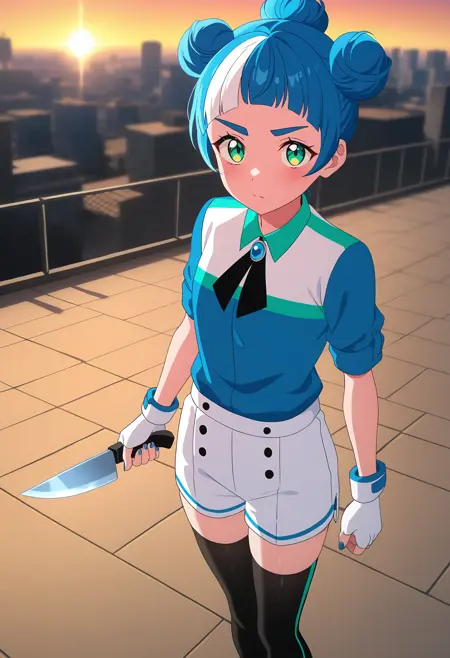 • 옷차림: 검은 허벅지 양말, 장갑, 셔츠, 파란 셔츠, 반바지, 흰 반바지, 흰 장갑, 손가락 없는 장갑, 부츠