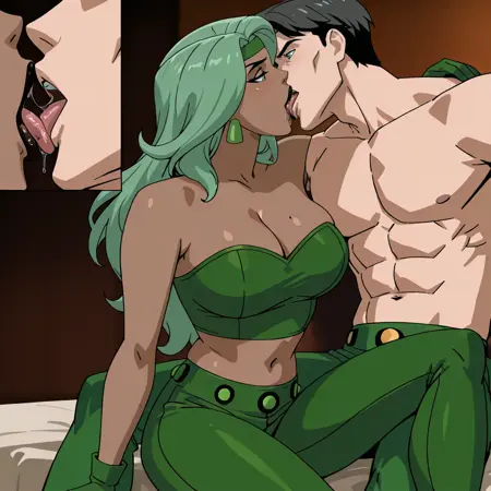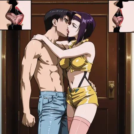 トリガー:xraytongue, (1boy:1.5, 黒髪, 上半身裸, ジーンズ, 短髪, メガネなし,), ヘテロ, フレンチキス, 舌を出す, 唾液, カップル