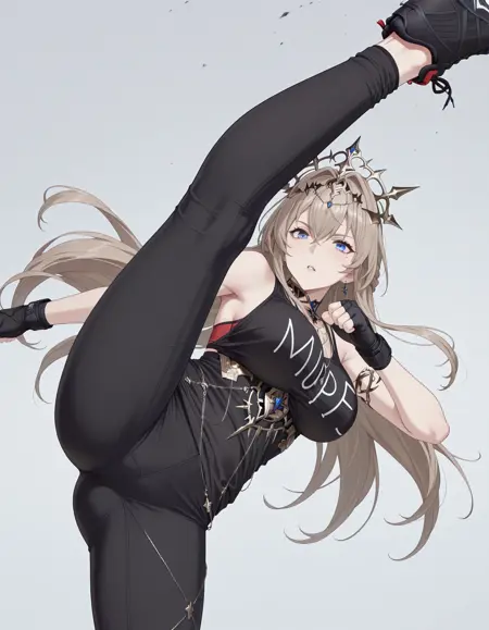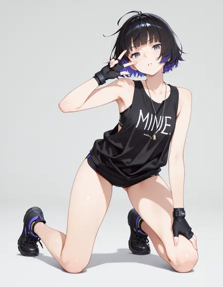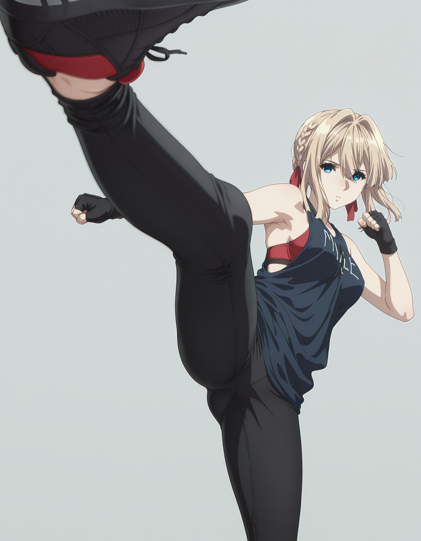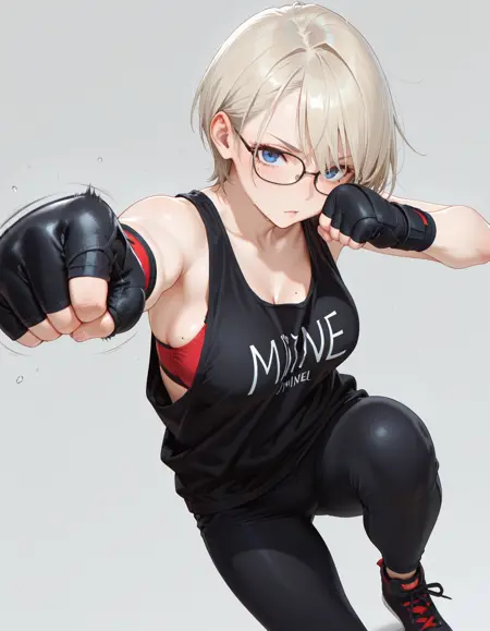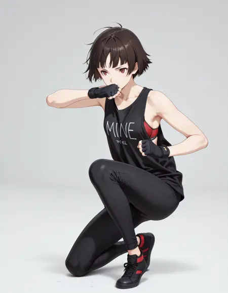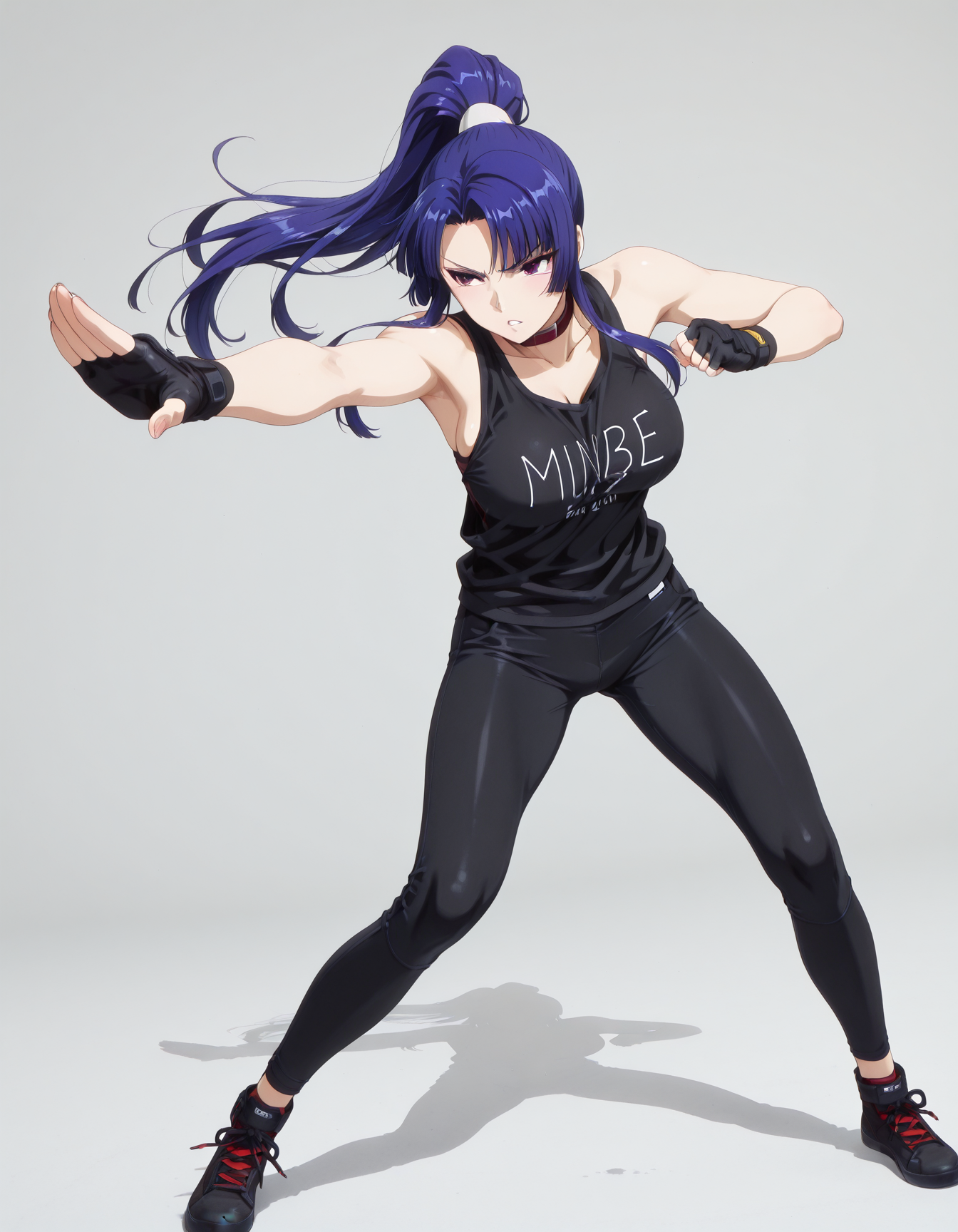 mai_bj_clothing_fighting_girl,tank_top,red bra,black_gloves,fingerless_gloves,black_pants,black_footwear,sneakers