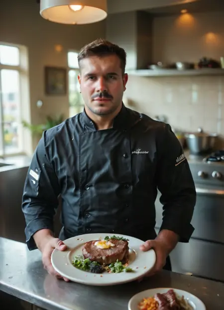 Prompt: Realistic photo, very beautiful Man ,chef, restaurant kitchen,