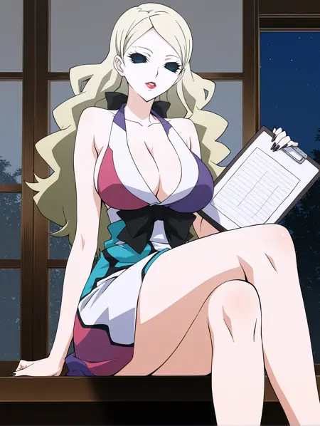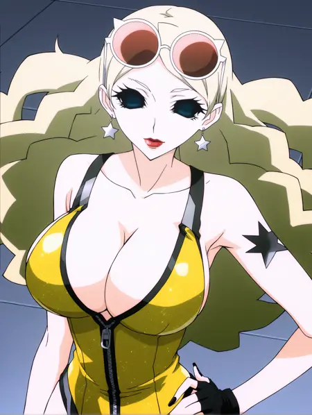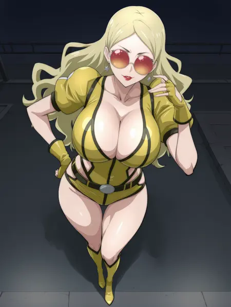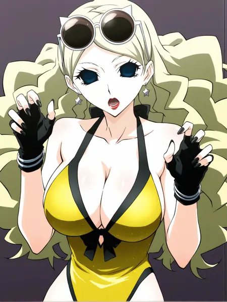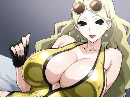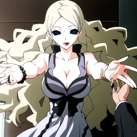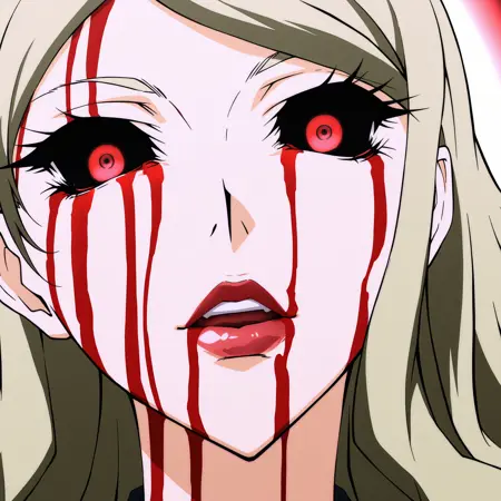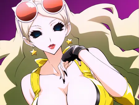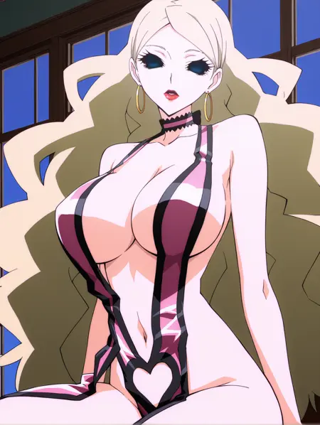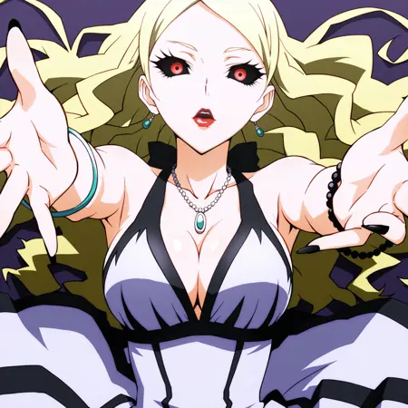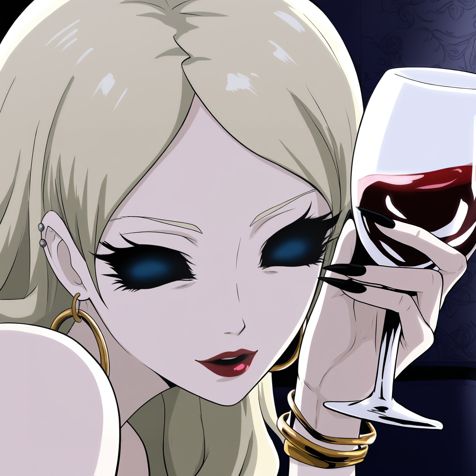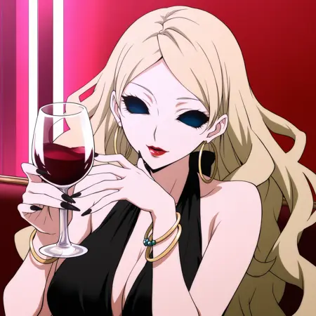 IL_Chizuru Kirishiki,1girl,blonde hair,wavy hair,long hair,jewelry,bracelet,makeup,lipstick,red lips,hoop earrings,black nails,long fingernails
