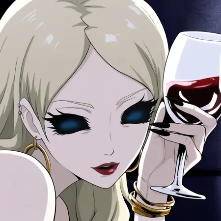 IL_キリシキ チズル,1girl,金髪,ウェーブヘア,ロングヘア, jewelry,ブレスレット,化粧,リップスティック,赤い唇,ホープイヤリング,黒い爪,長い爪