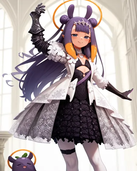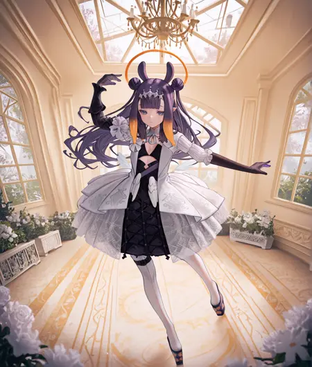 衣装タグ: フリル、翼、(白いドレス:1)、黒いドレス、ハロー、白い花、ティアラ、ダイヤモンドヘアバンド、(太ももストラップ、白いパンスト:1)、(黒い手袋、肘まで手袋、非対称手袋、長袖:1)、(片手のガントレット:1)、(プラットフォームシューズ:1)