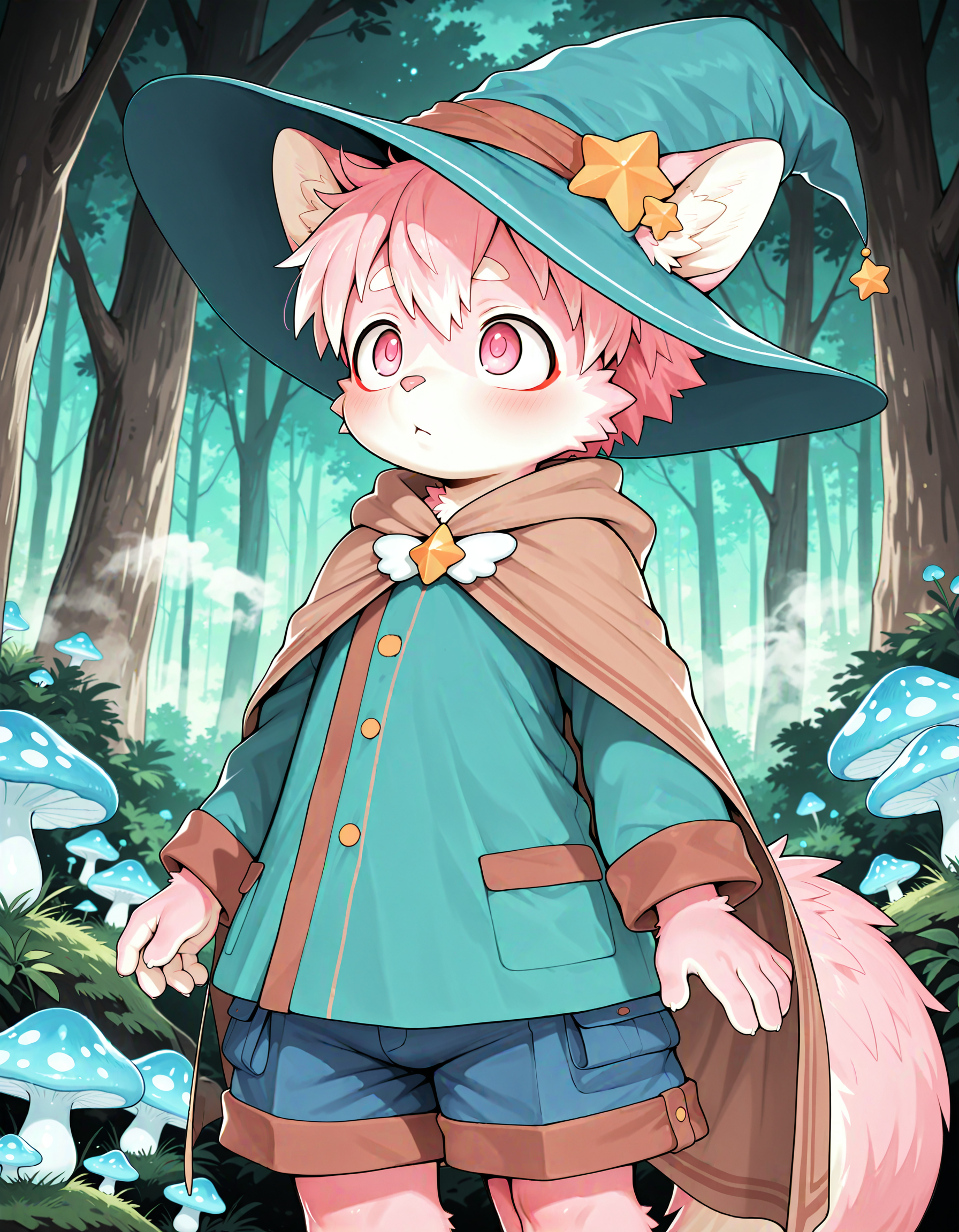 옷: nokurclothing, 마녀 모자, 후드, 망토, 긴 소매, 갈색 망토, 파란색 옷, 파란색 반바지, 날개 및 별 브로치