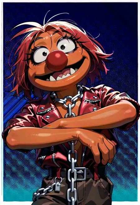 An1imaalTM, 1boy, bright orange skin, wild red hair, bulging black eyes, black eyelashes, silver chain, tattered yellow-red jacket, brown ripped pants, large uneven teeth, red nose,
