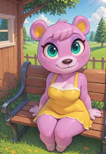 Megan \(animal crossing\), Animal crossing, anthro bear, furry female, Pink fur, blue pawpads, yellow inner ear, head tuft, blue freckles, teal eyes, pale pink muzzle, pale pink torso, tall