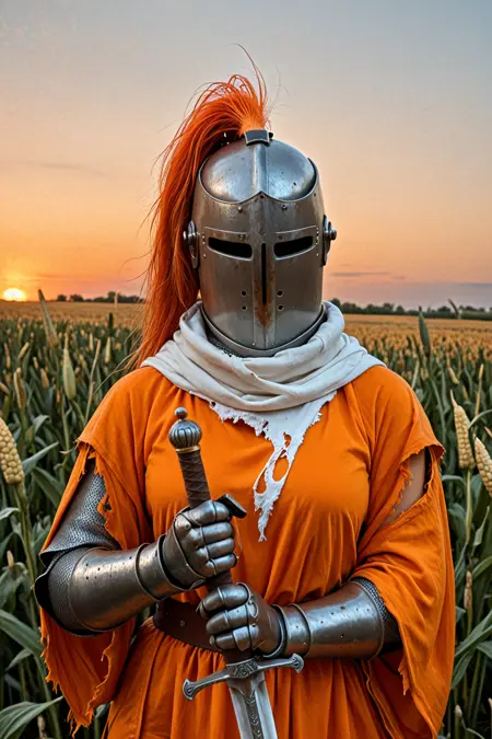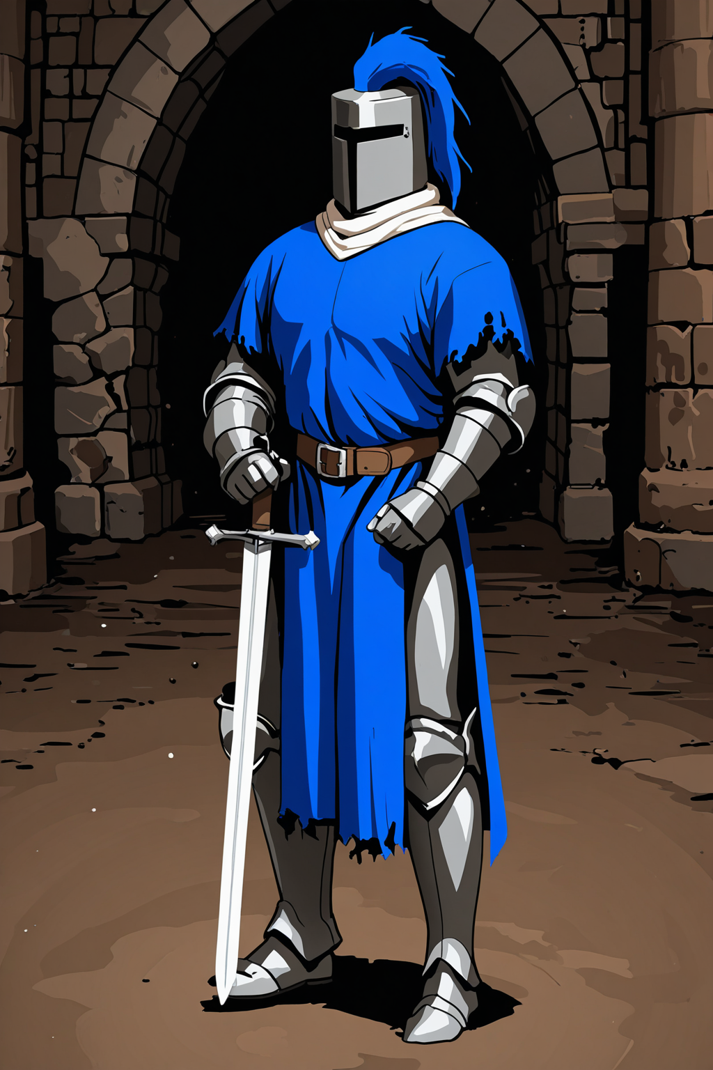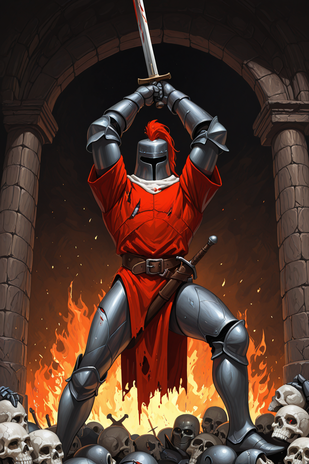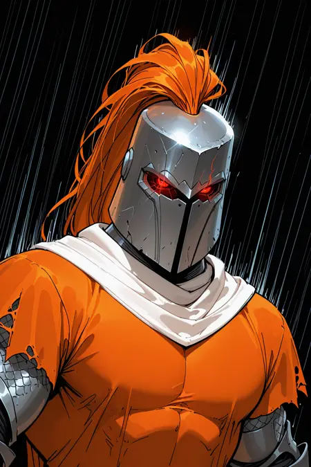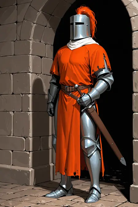 • 트리거: Moonknight, knight, 1boy, plume, helmet, white scarf, tabard, full armor, chainmail, gloves, gauntlets, waistband, armored boots