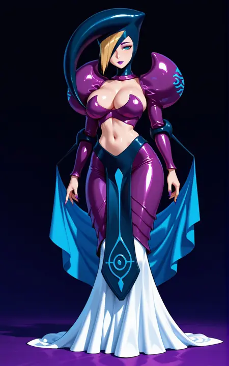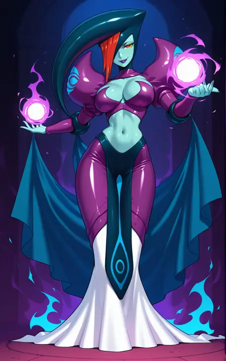 Veran, red bangs, red eyes, black hood, eye covering, covered eye, purple dress, puffy shoulders, black spiked elbow guards, blue elbow shawl, black waistcloth, white lower skirt, navel