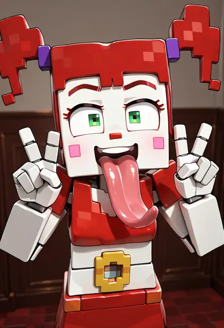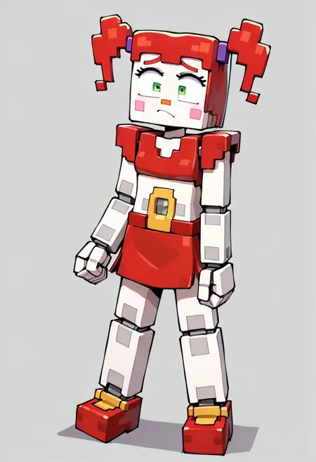| Trained Words | ZaminationCir1cusBby, 1girl, blocky rendition resembling Minecraft aesthetics, red top, red skirt, yellow mechanical detail on the torso, red shoes, bright red hair in two pigtails, vibrant green eyes, pink cheeks, small red nose, pale white skin, robot joints, square body, square arms, robot joints, purple-blue eyebrows,Copied! |