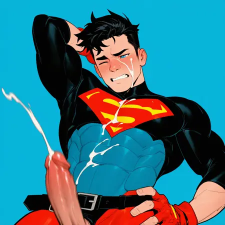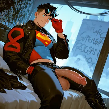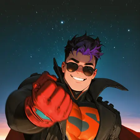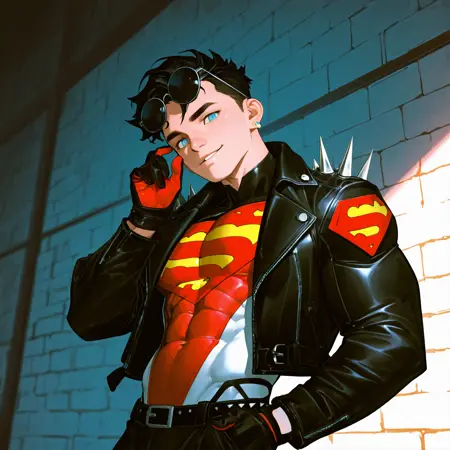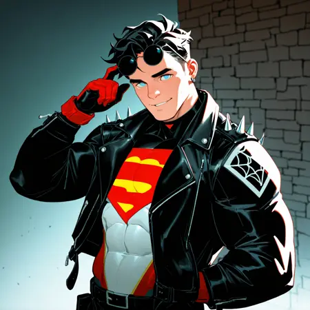 <lora:CONNER_PUNK:1> connerpunk, 검은 머리, 남성 중심, 단발, 1boy, 재킷, 단독, 검은 재킷, 바디수트, 미소, 열린 재킷, 슈퍼히어로, 장갑, 열린 옷, 보는 시선, 근육질, 가죽 재킷, 근육질 남성, 빨간 장갑, 가죽, 이 tone 바디수트, 파란 눈, 벨트