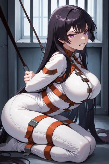 스트레이트잭킷을 원할 경우 "smgisk, 검은 머리, 매우 긴 머리, 보라색 눈, 히메 컷, 흰색 바디수트, 스트레이트잭킷, 검은 끈"을 추가하세요.