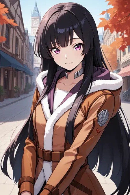 캐주얼 복장을 원할 경우 "smgisk, 검은 머리, 매우 긴 머리, 보라색 눈, 히메 컷, 초커, 후드 아래로, 검은 셔츠, 갈색 코트, 털 장식이 있는 코트, 검은 팬티스타킹, 검은 부츠, 허벅지 부츠"를 추가하세요.