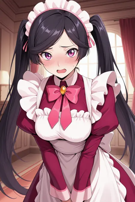 메이드/웹스터 복장을 원할 경우 "smgisk, 검은 머리, 매우 긴 머리, 보라색 눈, 트윈테일, 흰색 머리장식, 빨간 드레스, 분홍색 리본, 줄리엣 소매, 흰색 앞치마, 메이드 앞치마"를 추가하세요.