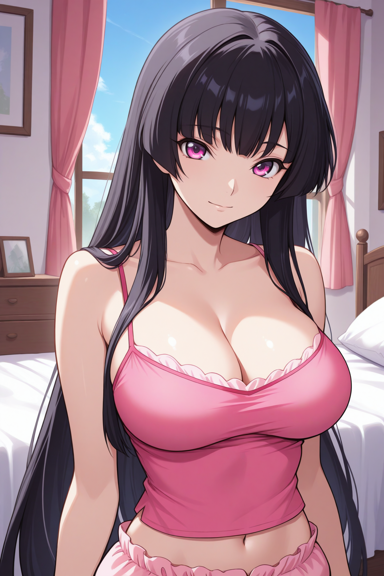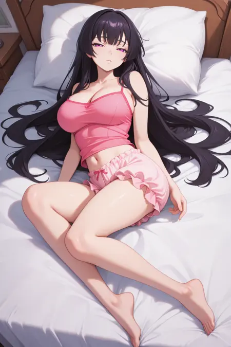 캐주얼 복장을 원할 경우 "smgisk, 검은 머리, 매우 긴 머리, 보라색 눈, 큰 가슴, 분홍색 캐미솔, 젖가슴, 배꼽, 연분홍색 블루머"를 추가하세요.