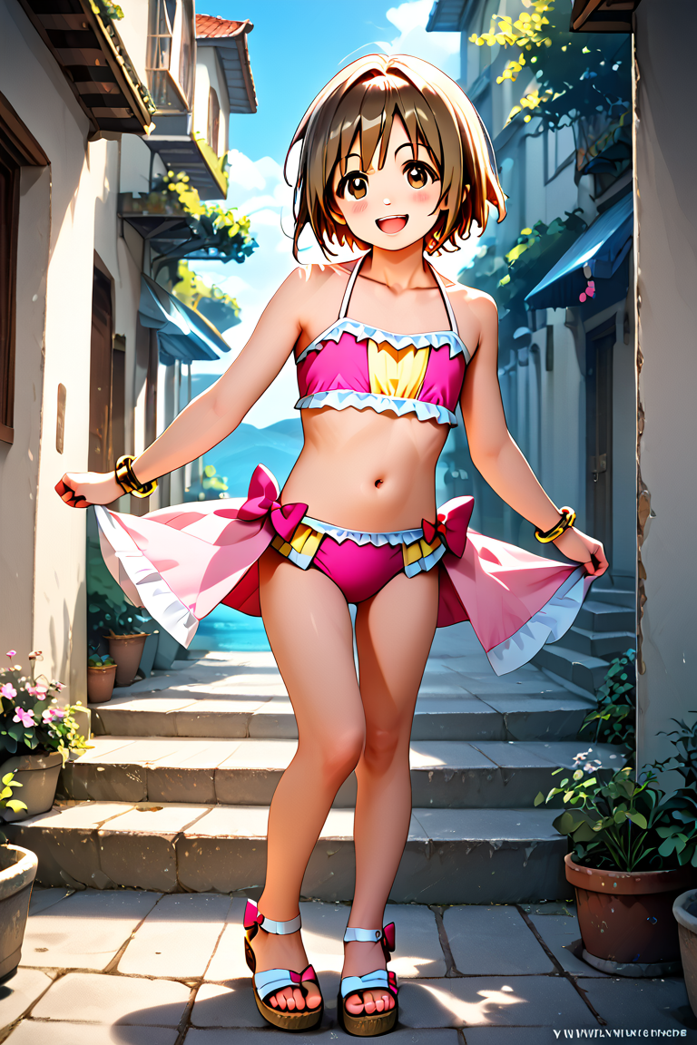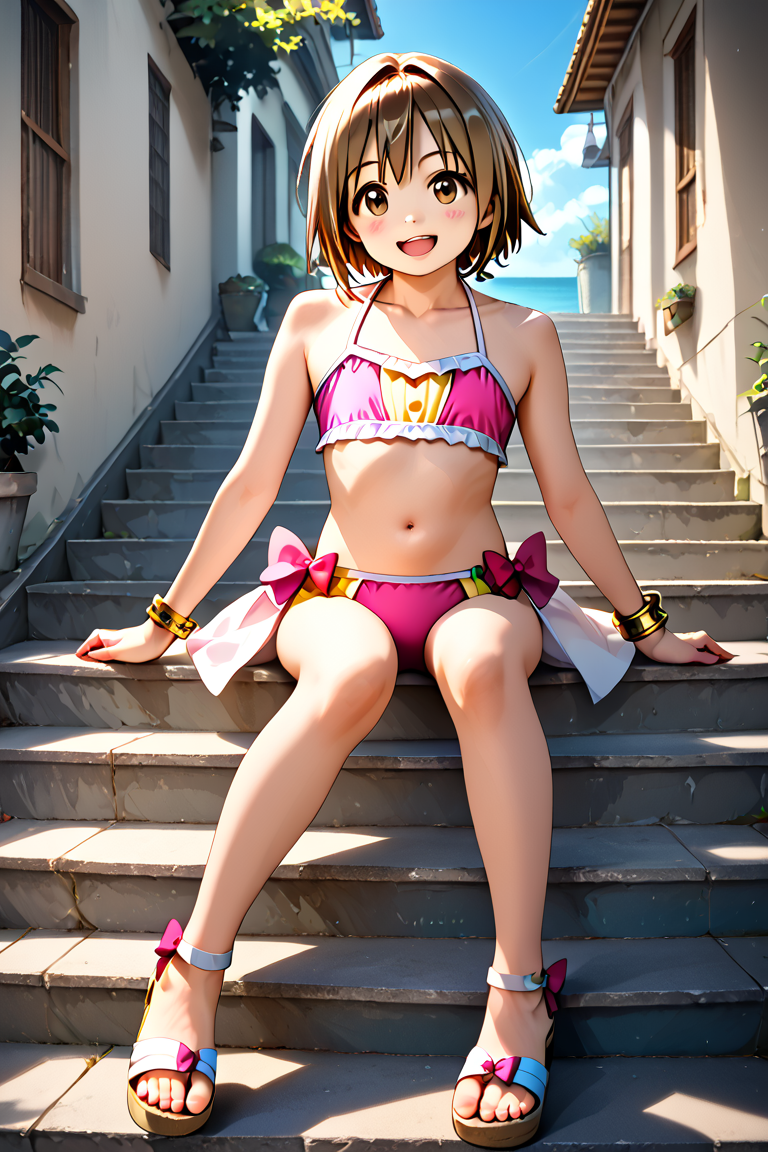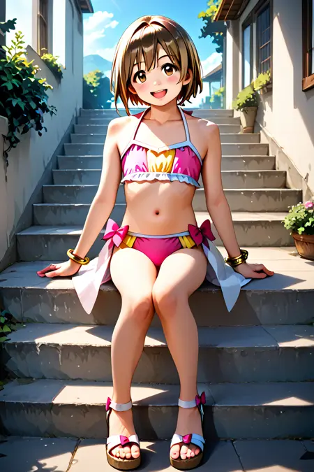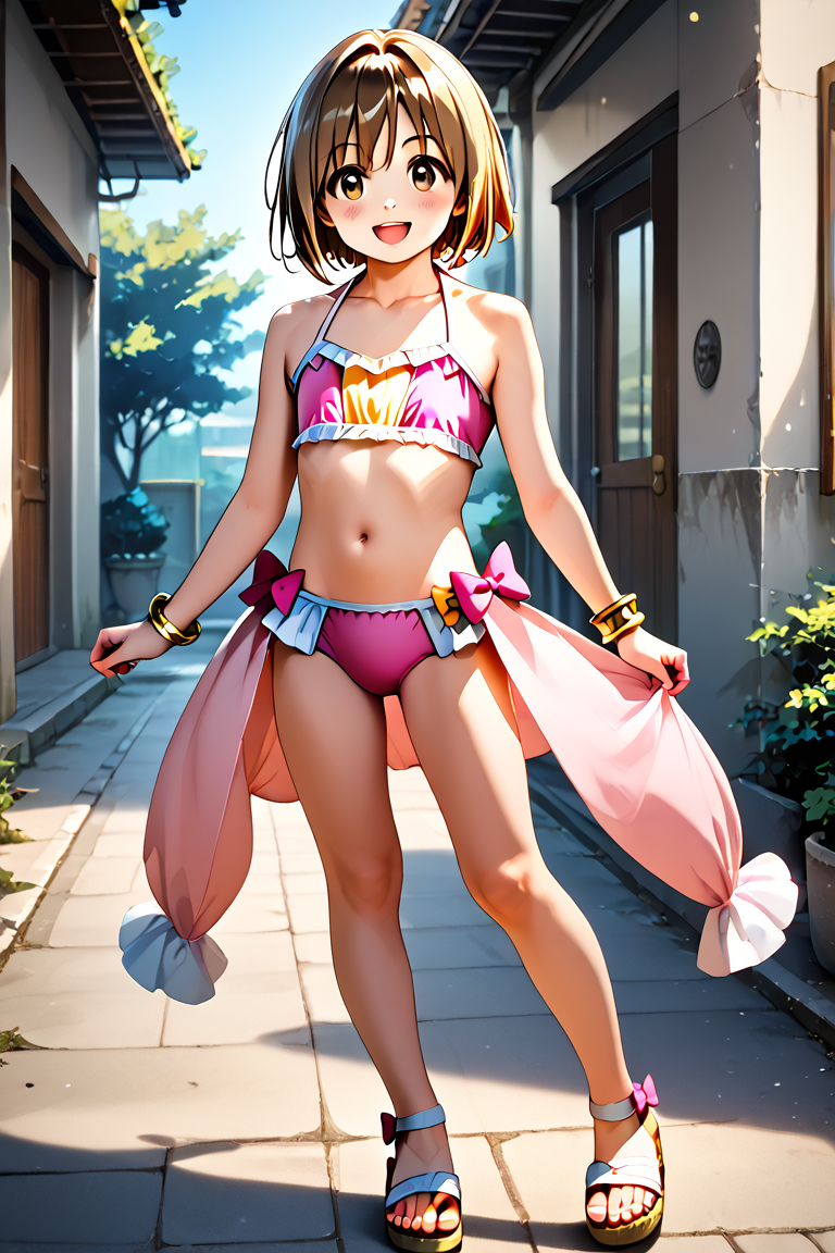 yuzuka, 1girl, solo, short hair, brown hair, bow, navel, jewelry, brown eyes, swimsuit, bikini, yellow bracelet, sandals, pink bikini, looking at viewer, collarbone, full body, magical girl,