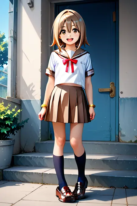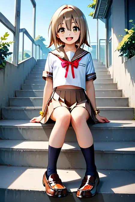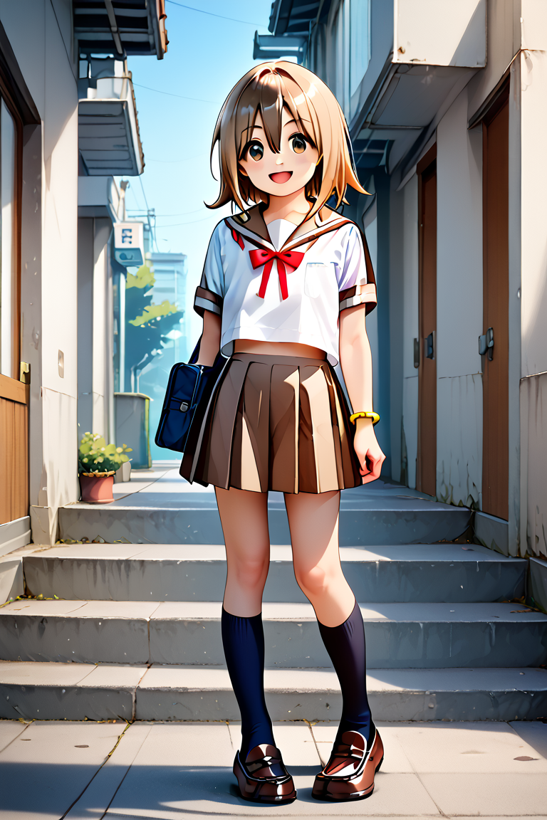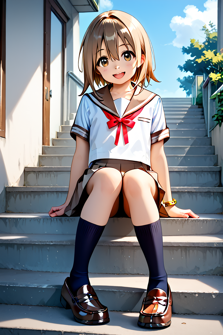 yuzuka, 1girl, solo, short hair, bow, hair between eyes, jewelry, school uniform, white shirt, short sleeves, medium hair, sailor collar, yellow bracelet, red ribbon, kneehighs, neck ribbon, brown shoes, light brown hair, black socks, brown skirt,