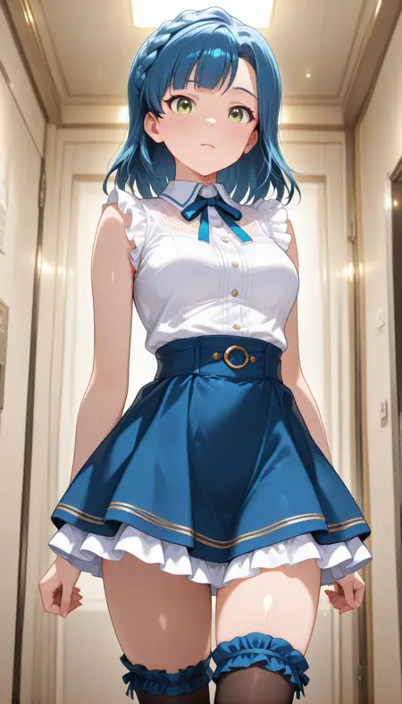 셔츠, 치마, 투명양말, 리본, 흰 셔츠, 주름, 소매 없음, 칼라 셔츠, 검은 투명양말, 미니 치마, 파란 치마, 젯타이 루이키, 소매 없는 셔츠, 팔 노출, 목 띠, 단추, 주름진 치마, 파란 리본, 셔츠 넣기, 웨딩 가터, 층층이 쌓인 치마, 주름진 투명양말,