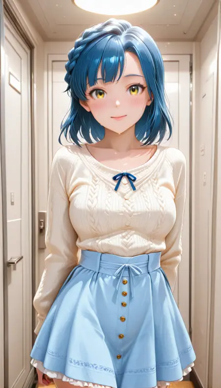 셔츠, 치마, 긴 소매, 리본, 학교_uniform, 흰 셔츠, 주름 치마, 세라후쿠, 넥타이, 해적 칼라, 미니 치마, 파란 치마, 파란 리본, 카디건, 흰 해적 칼라, 파란 넥타이, 열린 카디건, 파란 카디건, 열린 옷,