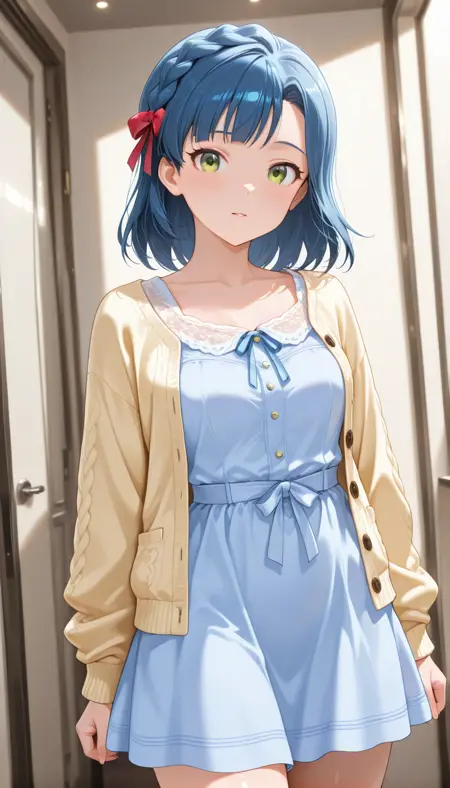 긴 소매, 드레스, 리본, 띠, 재킷, 어깨뼈, 머리 리본, 허벅지, 열린 옷, 흰 드레스, 빨간 띠, 단추, 파란 드레스, 카디건, 노랑 재킷, 열린 카디건, 노랑 카디건, 머리 리본,