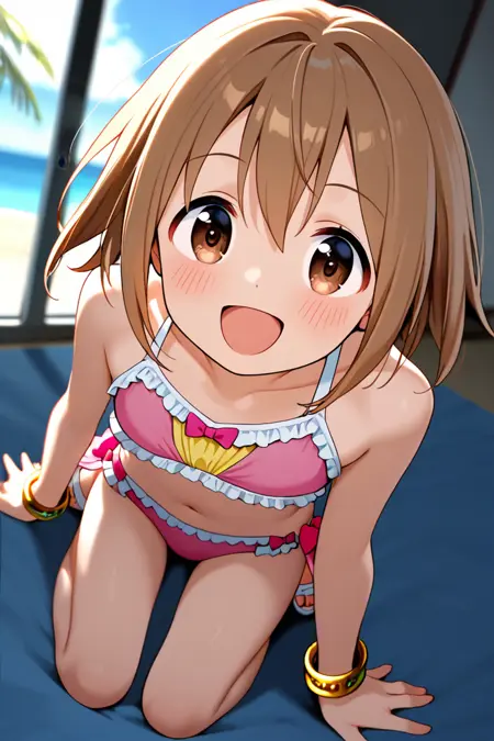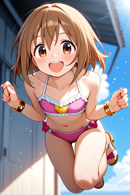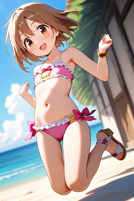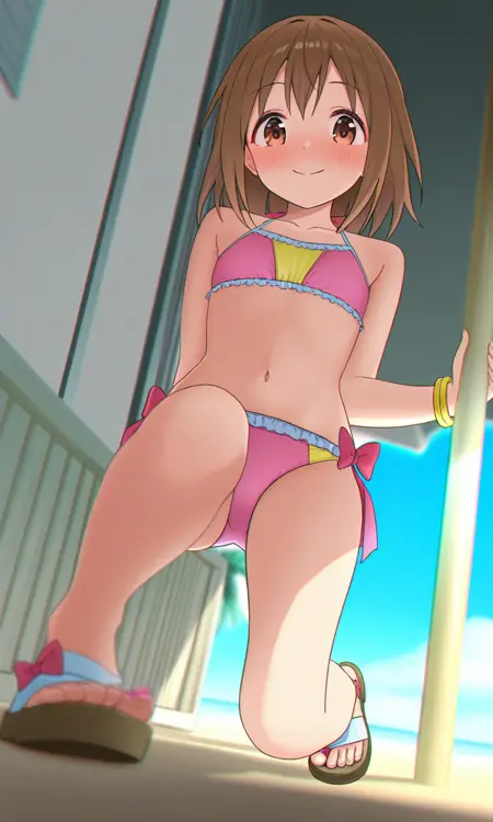 yuzuka, 1girl, solo, 단발, 갈색 머리, 리본, 배꼽, 보석, 갈색 눈, 수영복, 비키니, 노랑 팔찌, 샌들, 핑크 비키니, 시청자 바라보기, 쇄골, 전체 신체, 마법소녀,
