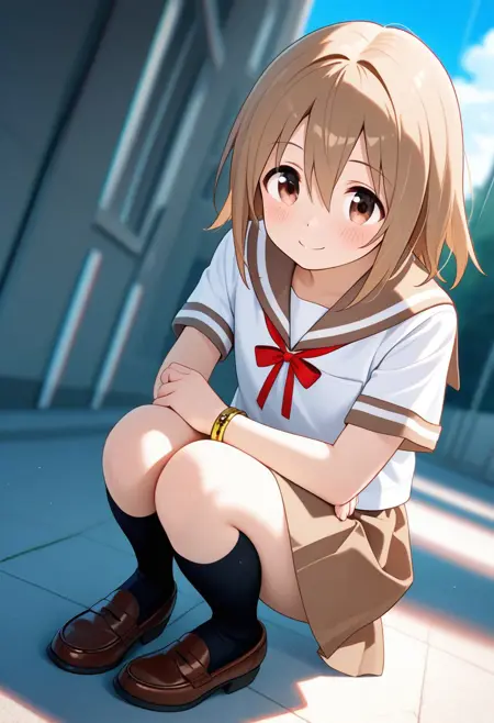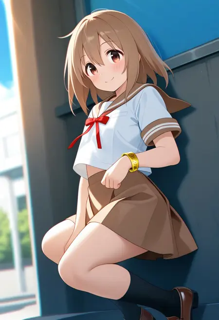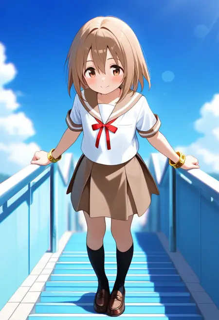 yuzuka, 1girl, solo, 단발, 리본, 눈 사이의 머리카락, 보석, 학교 복장, 흰 셔츠, 짧은 소매, 중간 길이 머리, 해적 칼라, 노랑 팔찌, 빨간 리본, 무릎까지 양말, 목 리본, 갈색 구두, 연한 갈색 머리, 검은 양말, 갈색 스커트,