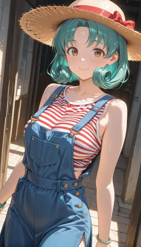 2. 셔츠, 드레스, 모자, 리본, 보석, 어깨 노출, 칼라뼈, 소매 없음, 줄무늬 옷, 빨간 리본, 팔찌, 크롭탑, 소매 없는 셔츠, 팔 노출, 모자 리본, 청바지, 빨간 셔츠, 모자 리본, 사이드 슬릿, 햇빛 모자, 줄무늬 셔츠, 짚 모자, 오버올, 파란 오버올, 오버올 치마