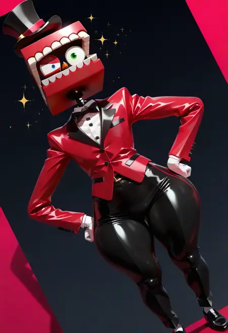 | Trained Words | ZaminationCaine, 1boy, whimsical design, large red jaw with white teeth as its head, mismatched multicolored square bule and green eyes, black top hat with a red stripe, red suit jacket with black lapels, white shirt, black bow tie, black pants, black shoes, white gloves, blocky design, cubic aesthetic, square arms, square body,Copied! |