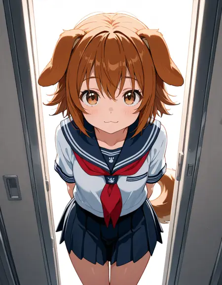 short hair, brown hair, brown eyes, dog ears, dog tail, dog girl