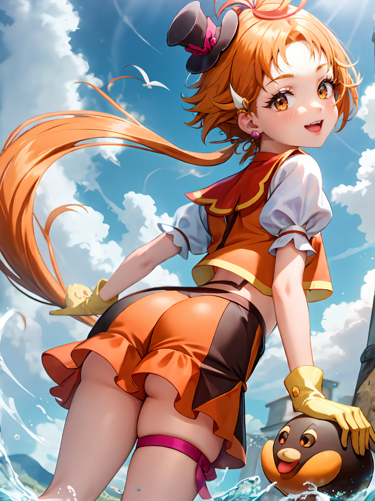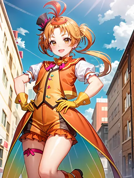 Prompts: vest, skirt, streaked hair, knee bots, puffy short sleeves,multicolored hair,thigh strap,mini top hat yellow gloves,puffy sleeves, orange footwear, short sleeves, shorts,bow orange eyes,top hat, orange glooves,mini hat, earrings, solo, orange hair