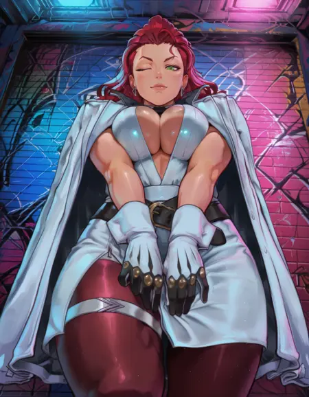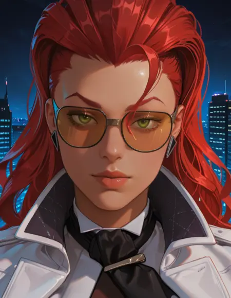 肩部披着夹克,中心开口被覆盖,白色手套,腰带,裙摆,大腿绑带,丝袜,短裤,耳环,有色眼镜或墨镜,