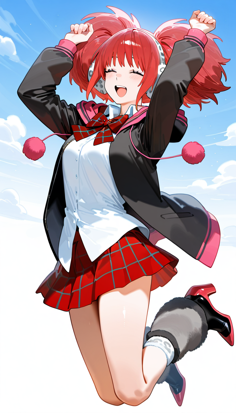 YotsubaZE1Outfit, white collared shirt, open collar, red plaid bowtie, black hooded jacket with pom pom drawstrings, open jacket, red plaid skirt, pom-pom-attached grey leg warmers, two-tone high heels