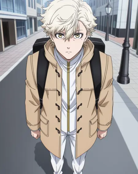 カジュアルな服装: 白いシャツ、茶色のコート、白いズボン、黒いバックパック、