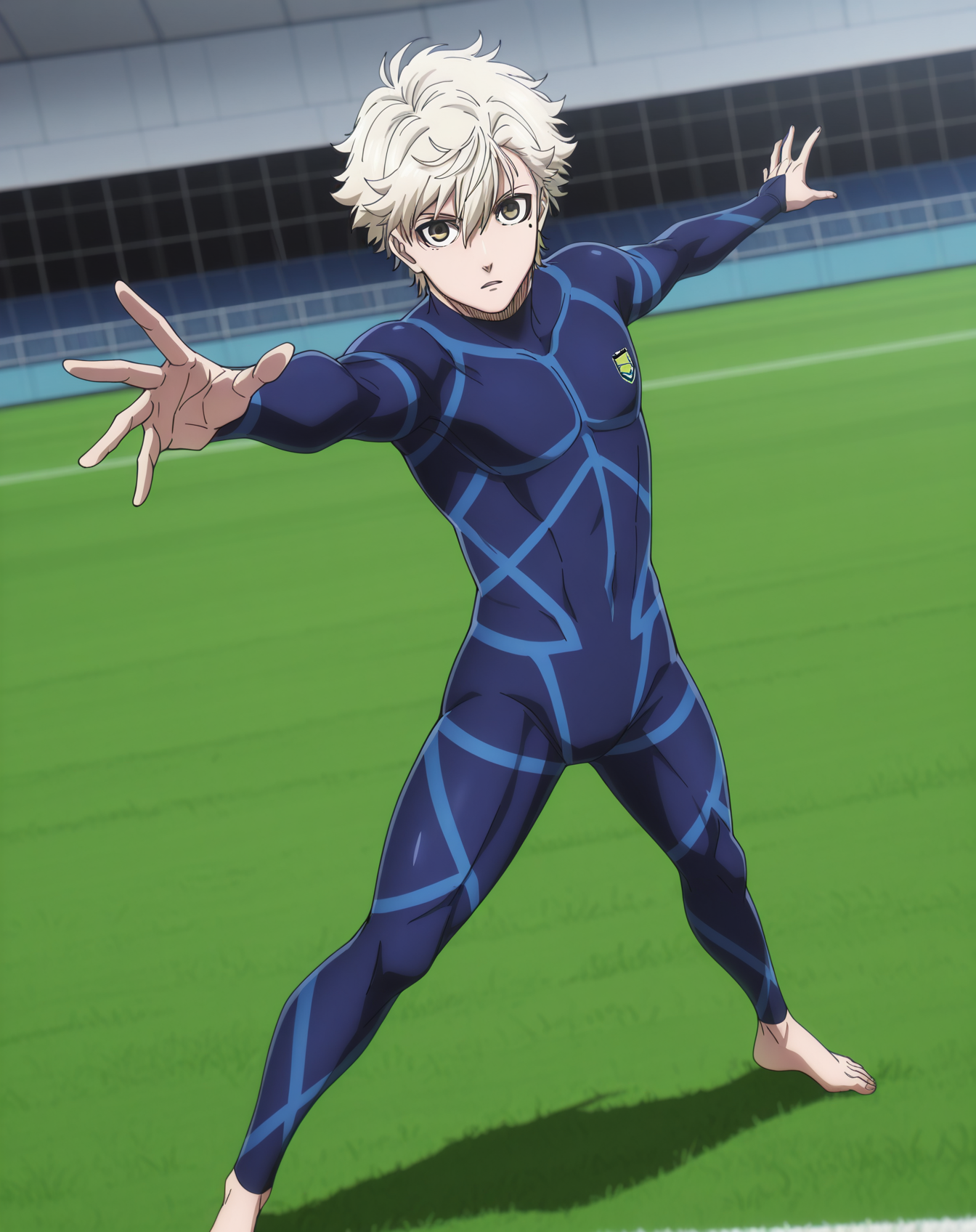 Blue Lockのユニフォーム: 青いボディスーツ、ぴっちりした、青いボディスーツ、