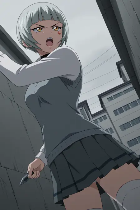 koshaji, short hair, grey hair, sidelocks, blunt bangs, yellow eyes, cross facial mark, choker, long sleeves, white shirt, collared shirt, grey vest, grey skirt, pleated skirt, white thighhighs, brown footwear, loafers