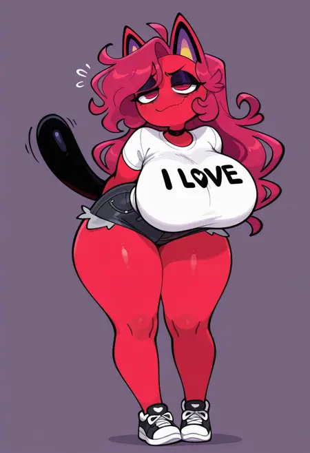 マスターピース、最高品質、驚異的な品質、非常に審美性が高い、高解像度、超詳細、absurdres、最新、明るい赤い体、明るい赤い毛、赤い目、波打つ髪、マゼンタ色の髪、長い髪、濃い紫のアイシャドウ、黒い尾、丸い尾、多色の内耳、猫の耳、鼻なし、鼻がない、全身、にやりとした笑み、一人、1人の女の子、ふっくらとした、巨大な胸、広いヒップ、