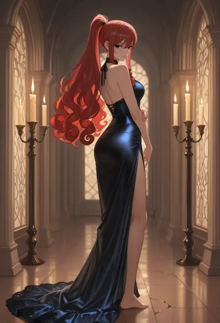 Erz4Sc4rlet, 1girl, red hair, long hair, black eyes
