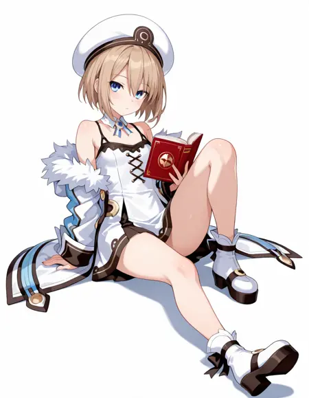 Blancdef, blc_neck_ribbon, blc_brooch, blc_fur-trimmed_coat, open coat, blc_dress, blc_hat, blc_spaghetti strap, blc_ankle_ribbon, blc_platform_footwear,ankle ribbon