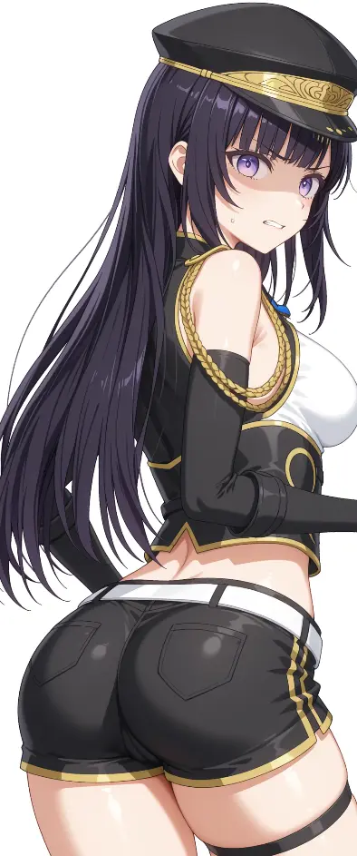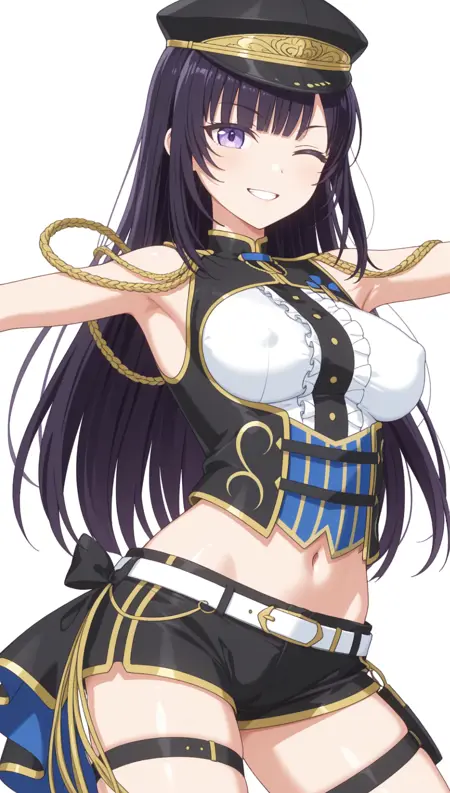 black headwear, peaked cap, white shirt, sleeveless shirt, midriff, covered nipples, navel, aiguillette, epaulettes, black gloves, elbow gloves,