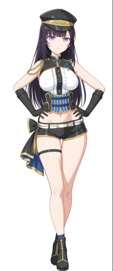 黑色头饰,鸭舌帽,白衬衫,无袖上衣,露出腹部,乳头被遮盖,肚脐,肩章绳,肩章,
