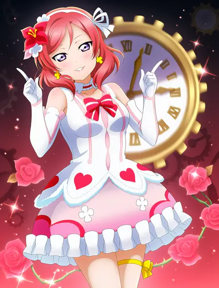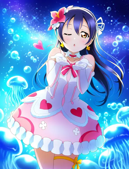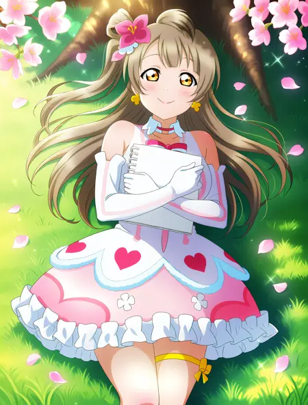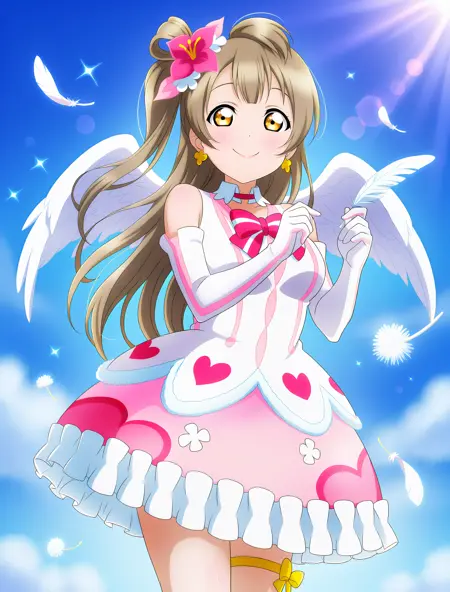 kosaka honoka, alternate hairstyle, medium hair, single hair bun, pink hibiscus hair ornament, hairband, hair ribbon, yellow earrings, clover earrings🚫 Negative / ネガティブ